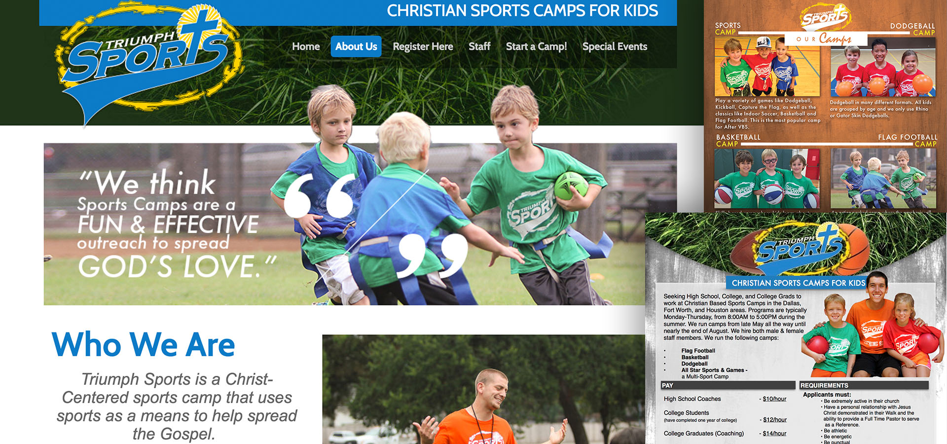 Triumph Sports offers year-round kids sports camps and birthday parties at churches around Texas. We created a new interactive website for Triumph, as well as print material, and even internal staff training videos.